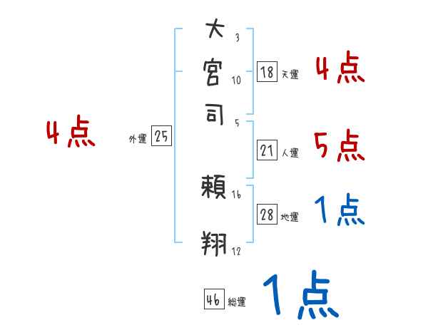 天運![]() | 大宮司頼翔さんの天運は18画の4つ星!情熱的で剛気。忍耐力があり信頼される。 家系が持つ宿命的な運勢を表します。祖先から受け継いだ苗字ですので自分の力が及びません。家柄を象徴します。 |