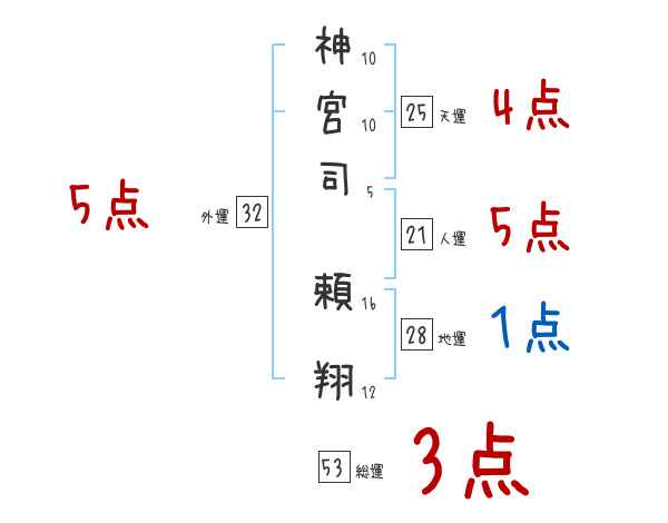 外運![]() | 神宮司頼翔さんの外運は32画の5つ星!柔軟性があり成功する。チャンスが多く金運が良い。 生活面を象徴する運勢です。外部から受ける影響力を表し、結婚運、家庭運や職場、環境への順応性を表します。 |