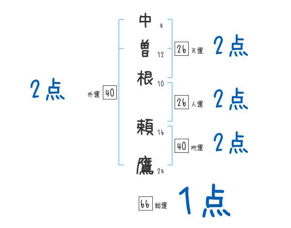 天運![]() | 中曽根頼鷹さんの天運は26画の2つ星!波瀾万丈かも。信頼できる人を大事にしましょう。 家系が持つ宿命的な運勢を表します。祖先から受け継いだ苗字ですので自分の力が及びません。家柄を象徴します。 |