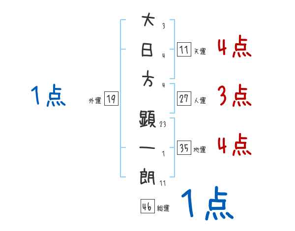 総運![]() | 大日方顕一朗さんの総運は46画の1つ星!迷走することが多く苦労するかも。目先のことにとらわれないように。 あなたの人生を表す1番重要な運勢です。生涯を通じて影響する総合運となり、主に50歳以降の晩年期に影響を及ぼします。 |