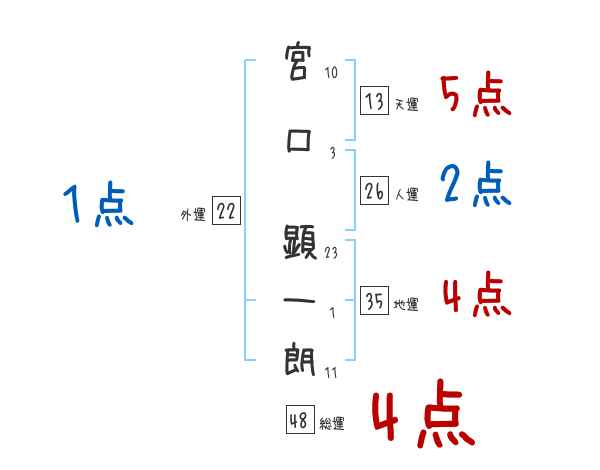 外運![]() | 宮口顕一朗さんの外運は22画の1つ星!努力することが苦手ないっぽう手先が器用。芸術性にも優れる。 生活面を象徴する運勢です。外部から受ける影響力を表し、結婚運、家庭運や職場、環境への順応性を表します。 |