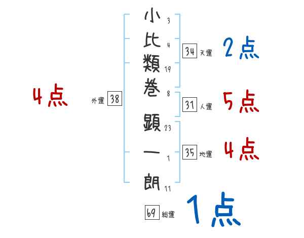 外運![]() | 小比類巻顕一朗さんの外運は38画の4つ星!温厚な性格で技術的な才能を発揮する。職人的な仕事に向いている。 生活面を象徴する運勢です。外部から受ける影響力を表し、結婚運、家庭運や職場、環境への順応性を表します。 |