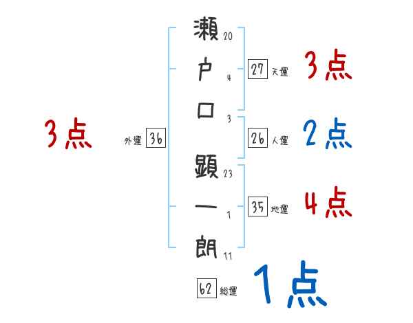外運![]() | 瀬戸口顕一朗さんの外運は36画の3つ星!先見性が豊かです。多少神経質で苦労することも。 生活面を象徴する運勢です。外部から受ける影響力を表し、結婚運、家庭運や職場、環境への順応性を表します。 |