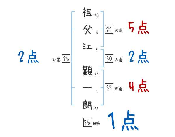 天運![]() | 祖父江顕一朗さんの天運は21画の5つ星!統率力がある。独立し成功する。名誉を手に入れる。 家系が持つ宿命的な運勢を表します。祖先から受け継いだ苗字ですので自分の力が及びません。家柄を象徴します。 |