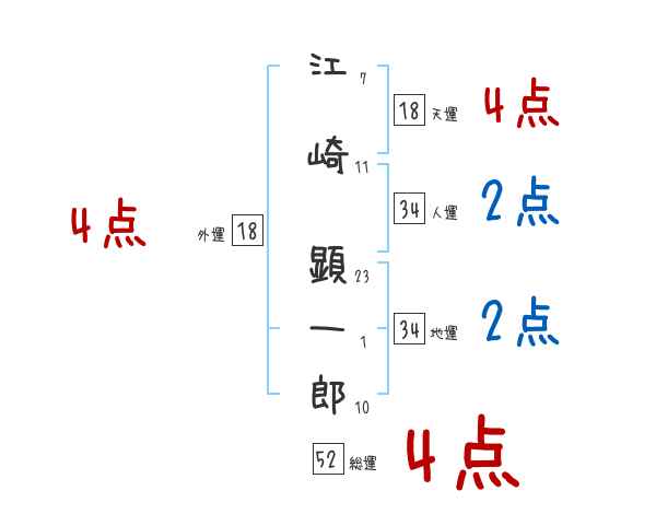 天運![]() | 江崎顕一郎さんの天運は18画の4つ星!情熱的で剛気。忍耐力があり信頼される。 家系が持つ宿命的な運勢を表します。祖先から受け継いだ苗字ですので自分の力が及びません。家柄を象徴します。 |