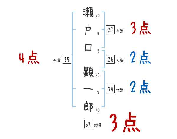 外運![]() | 瀬戸口顕一郎さんの外運は35画の4つ星!温厚な性格で感受性が高い。穏和な性格で人望が厚い。 生活面を象徴する運勢です。外部から受ける影響力を表し、結婚運、家庭運や職場、環境への順応性を表します。 |