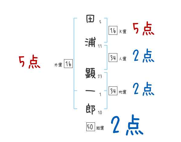 総運![]() | 田浦顕一郎さんの総運は50画の2つ星!浮き沈みが激しく不安定。しりすぼみに衰退しやすいので注意しましょう。 あなたの人生を表す1番重要な運勢です。生涯を通じて影響する総合運となり、主に50歳以降の晩年期に影響を及ぼします。 |