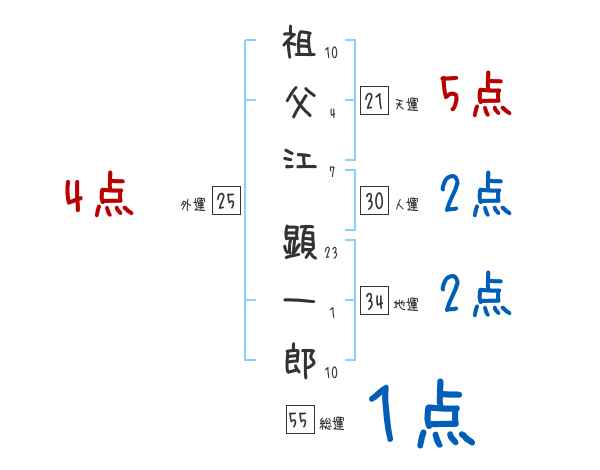 天運![]() | 祖父江顕一郎さんの天運は21画の5つ星!統率力がある。独立し成功する。名誉を手に入れる。 家系が持つ宿命的な運勢を表します。祖先から受け継いだ苗字ですので自分の力が及びません。家柄を象徴します。 |