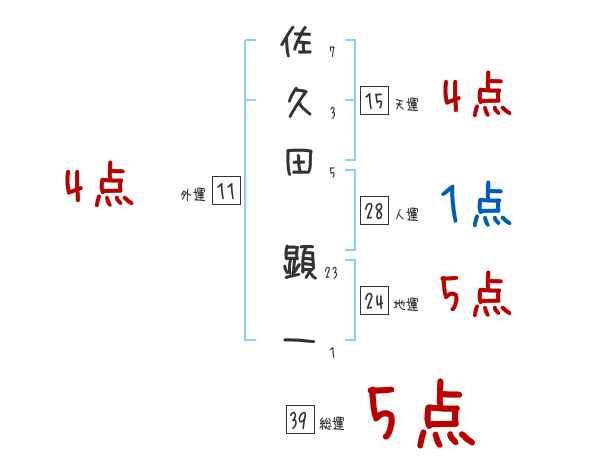 総運![]() | 佐久田顕一さんの総運は39画の5つ星!社交性に優れ人望が厚い。人の上に立ち成功する。 あなたの人生を表す1番重要な運勢です。生涯を通じて影響する総合運となり、主に50歳以降の晩年期に影響を及ぼします。 |