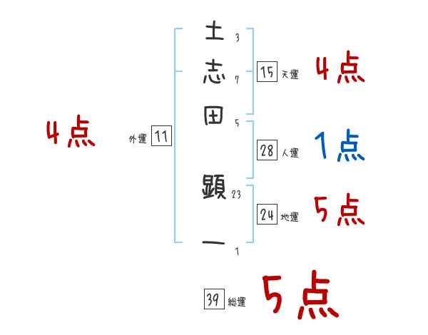 総運![]() | 土志田顕一さんの総運は39画の5つ星!社交性に優れ人望が厚い。人の上に立ち成功する。 あなたの人生を表す1番重要な運勢です。生涯を通じて影響する総合運となり、主に50歳以降の晩年期に影響を及ぼします。 |
