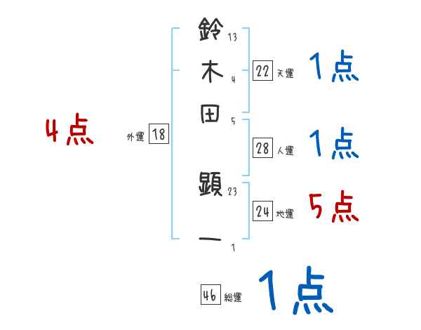 総運![]() | 鈴木田顕一さんの総運は46画の1つ星!迷走することが多く苦労するかも。目先のことにとらわれないように。 あなたの人生を表す1番重要な運勢です。生涯を通じて影響する総合運となり、主に50歳以降の晩年期に影響を及ぼします。 |