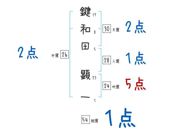 天運![]() | 鍵和田顕一さんの天運は30画の2つ星!浮き沈みの激しさに注意しましょう。 家系が持つ宿命的な運勢を表します。祖先から受け継いだ苗字ですので自分の力が及びません。家柄を象徴します。 |
