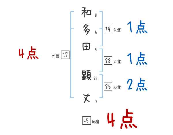 天運![]() | 和多田顕丈さんの天運は19画の1つ星!優れた才能を持ちますが、協調性が足りないことも。周りの人と協力する事を意識しましょう。 家系が持つ宿命的な運勢を表します。祖先から受け継いだ苗字ですので自分の力が及びません。家柄を象徴します。 |
