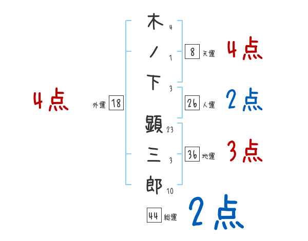 外運![]() | 木ノ下顕三郎さんの外運は18画の4つ星!情熱的で剛気。忍耐力があり信頼される。 生活面を象徴する運勢です。外部から受ける影響力を表し、結婚運、家庭運や職場、環境への順応性を表します。 |
