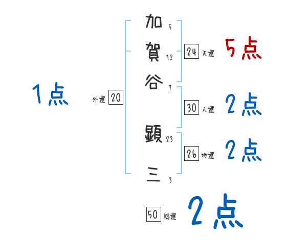 天運![]() | 加賀谷顕三さんの天運は24画の5つ星!家庭運が良く順調な人生。金運にも恵まれる。 家系が持つ宿命的な運勢を表します。祖先から受け継いだ苗字ですので自分の力が及びません。家柄を象徴します。 |