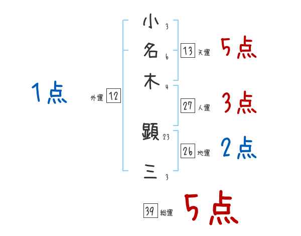 総運![]() | 小名木顕三さんの総運は39画の5つ星!社交性に優れ人望が厚い。人の上に立ち成功する。 あなたの人生を表す1番重要な運勢です。生涯を通じて影響する総合運となり、主に50歳以降の晩年期に影響を及ぼします。 |