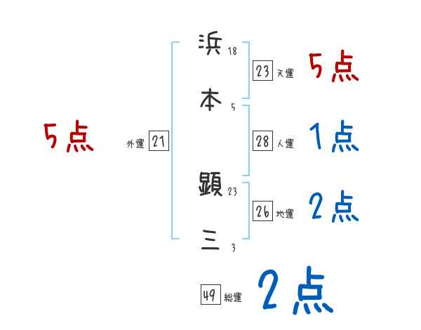 天運![]() | 浜本顕三さんの天運は23画の5つ星!想像力に優れ活力がある。一代で成功し名誉を手に入れる。 家系が持つ宿命的な運勢を表します。祖先から受け継いだ苗字ですので自分の力が及びません。家柄を象徴します。 |