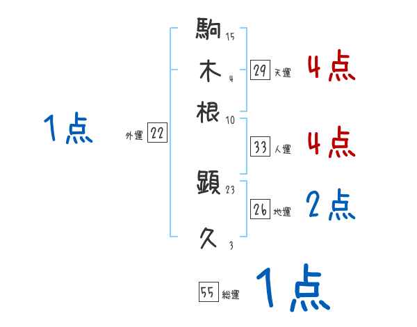 外運![]() | 駒木根顕久さんの外運は22画の1つ星!努力することが苦手ないっぽう手先が器用。芸術性にも優れる。 生活面を象徴する運勢です。外部から受ける影響力を表し、結婚運、家庭運や職場、環境への順応性を表します。 |