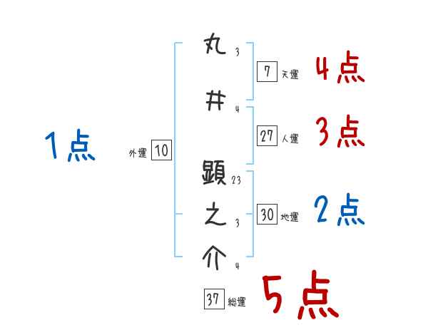 天運![]() | 丸井顕之介さんの天運は7画の4つ星!強い意志や信念を持ち独立心が強い。自立する。 家系が持つ宿命的な運勢を表します。祖先から受け継いだ苗字ですので自分の力が及びません。家柄を象徴します。 |