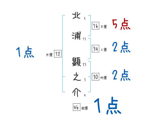 総運![]() | 北浦顕之介さんの総運は46画の1つ星!迷走することが多く苦労するかも。目先のことにとらわれないように。 あなたの人生を表す1番重要な運勢です。生涯を通じて影響する総合運となり、主に50歳以降の晩年期に影響を及ぼします。 |