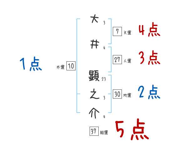 天運![]() | 大井顕之介さんの天運は7画の4つ星!強い意志や信念を持ち独立心が強い。自立する。 家系が持つ宿命的な運勢を表します。祖先から受け継いだ苗字ですので自分の力が及びません。家柄を象徴します。 |