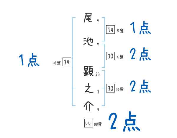 総運![]() | 尾池顕之介さんの総運は44画の2つ星!誠実で慎重な性格。物事を考えすぎないように注意しましょう。 あなたの人生を表す1番重要な運勢です。生涯を通じて影響する総合運となり、主に50歳以降の晩年期に影響を及ぼします。 |