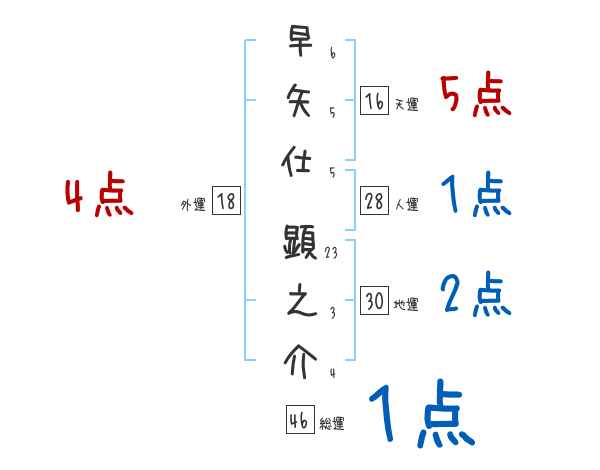 総運![]() | 早矢仕顕之介さんの総運は46画の1つ星!迷走することが多く苦労するかも。目先のことにとらわれないように。 あなたの人生を表す1番重要な運勢です。生涯を通じて影響する総合運となり、主に50歳以降の晩年期に影響を及ぼします。 |