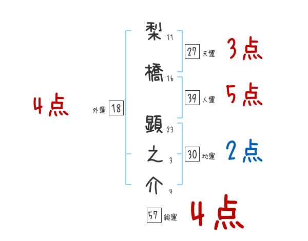 外運![]() | 梨橋顕之介さんの外運は18画の4つ星!情熱的で剛気。忍耐力があり信頼される。 生活面を象徴する運勢です。外部から受ける影響力を表し、結婚運、家庭運や職場、環境への順応性を表します。 |