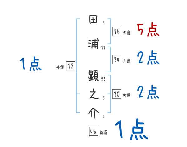 総運![]() | 田浦顕之介さんの総運は46画の1つ星!迷走することが多く苦労するかも。目先のことにとらわれないように。 あなたの人生を表す1番重要な運勢です。生涯を通じて影響する総合運となり、主に50歳以降の晩年期に影響を及ぼします。 |