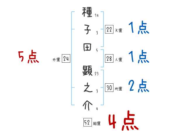 外運![]() | 種子田顕之介さんの外運は24画の5つ星!家庭運が良く順調な人生。金運にも恵まれる。 生活面を象徴する運勢です。外部から受ける影響力を表し、結婚運、家庭運や職場、環境への順応性を表します。 |