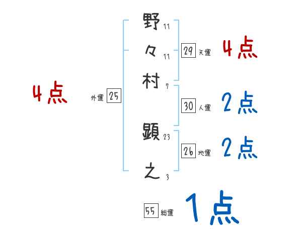 天運![]() | 野々村顕之さんの天運は29画の4つ星!完全主義で才能がある。厳格な心の持ち主。 家系が持つ宿命的な運勢を表します。祖先から受け継いだ苗字ですので自分の力が及びません。家柄を象徴します。 |