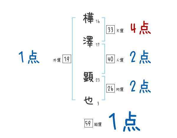 外運![]() | 樺澤顕也さんの外運は19画の1つ星!優れた才能を持ちますが、協調性が足りないことも。周りの人と協力する事を意識しましょう。 生活面を象徴する運勢です。外部から受ける影響力を表し、結婚運、家庭運や職場、環境への順応性を表します。 |
