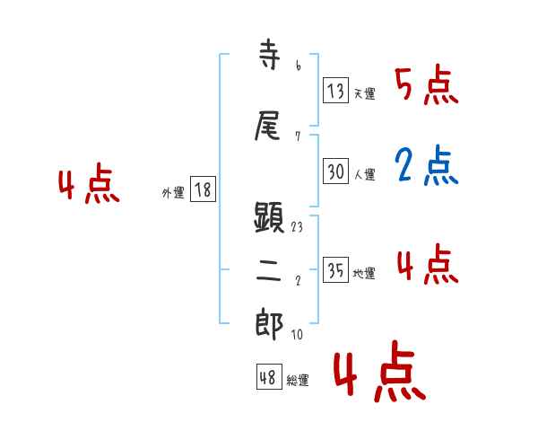 天運![]() | 寺尾顕二郎さんの天運は13画の5つ星!才能に恵まれ人気がある。名声を手に入れる。円満な人生。 家系が持つ宿命的な運勢を表します。祖先から受け継いだ苗字ですので自分の力が及びません。家柄を象徴します。 |