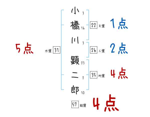 総運![]() | 小橋川顕二郎さんの総運は57画の4つ星!向上心があり人望がある。地位を得る。 あなたの人生を表す1番重要な運勢です。生涯を通じて影響する総合運となり、主に50歳以降の晩年期に影響を及ぼします。 |