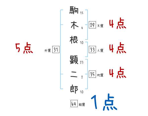 天運![]() | 駒木根顕二郎さんの天運は29画の4つ星!完全主義で才能がある。厳格な心の持ち主。 家系が持つ宿命的な運勢を表します。祖先から受け継いだ苗字ですので自分の力が及びません。家柄を象徴します。 |