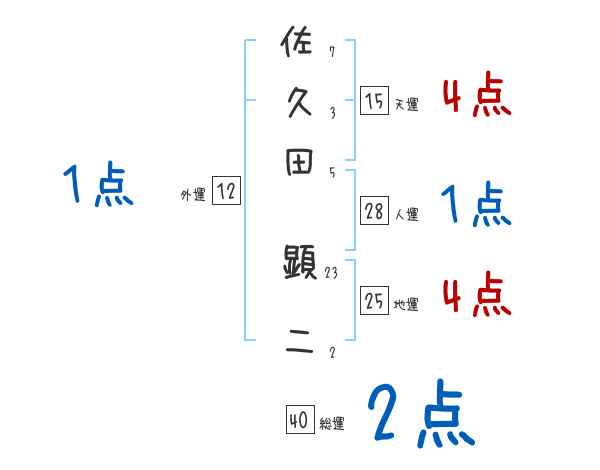 人運![]() | 佐久田顕二さんの人運は28画の1つ星!家庭環境に注意。スポーツで活躍できる能力があるかも。 性格や才能などを表す2番目に重要な運勢です。人間関係や協調性、社会的な成功に影響します。主に20歳から50歳ぐらいまでの中年期の運勢を表します。 |