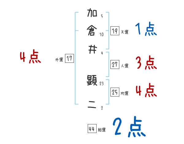 総運![]() | 加倉井顕二さんの総運は44画の2つ星!誠実で慎重な性格。物事を考えすぎないように注意しましょう。 あなたの人生を表す1番重要な運勢です。生涯を通じて影響する総合運となり、主に50歳以降の晩年期に影響を及ぼします。 |