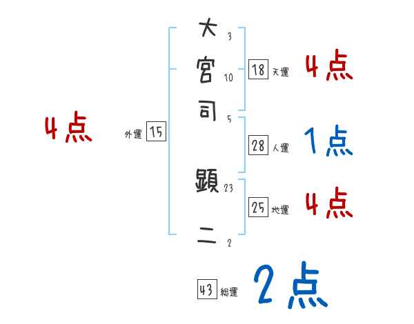 総運![]() | 大宮司顕二さんの総運は43画の2つ星!頑固な性格で独立心が強いかも。やや非現実的で浪費に注意しましょう。 あなたの人生を表す1番重要な運勢です。生涯を通じて影響する総合運となり、主に50歳以降の晩年期に影響を及ぼします。 |