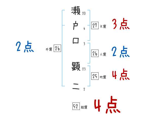 総運![]() | 瀬戸口顕二さんの総運は52画の4つ星!先見性と独創性に優れ考える力がある。強運の持ち主。 あなたの人生を表す1番重要な運勢です。生涯を通じて影響する総合運となり、主に50歳以降の晩年期に影響を及ぼします。 |