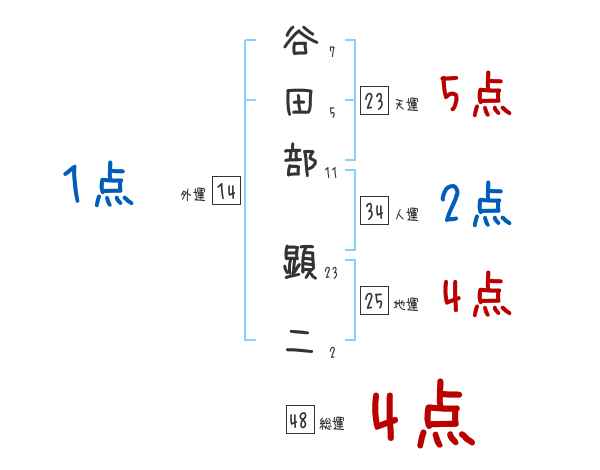天運![]() | 谷田部顕二さんの天運は23画の5つ星!想像力に優れ活力がある。一代で成功し名誉を手に入れる。 家系が持つ宿命的な運勢を表します。祖先から受け継いだ苗字ですので自分の力が及びません。家柄を象徴します。 |
