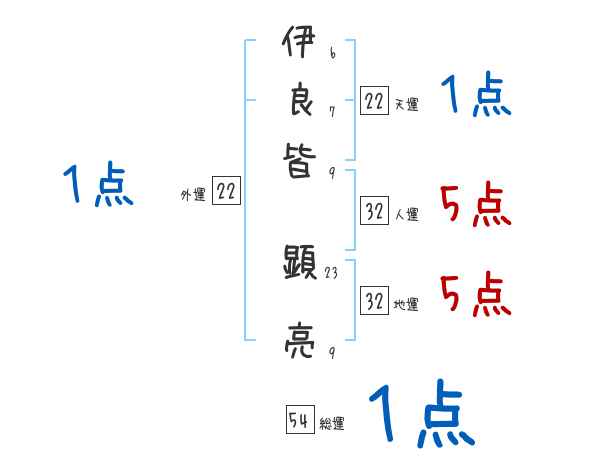 総運![]() | 伊良皆顕亮さんの総運は54画の1つ星!トラブルが多いかも。周りをよく見て協調して過ごしましょう。 あなたの人生を表す1番重要な運勢です。生涯を通じて影響する総合運となり、主に50歳以降の晩年期に影響を及ぼします。 |