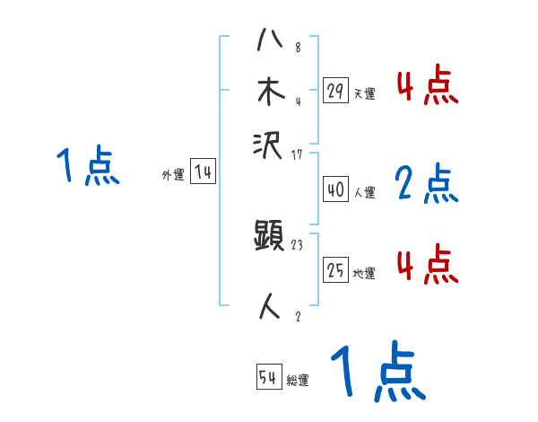 総運![]() | 八木沢顕人さんの総運は54画の1つ星!トラブルが多いかも。周りをよく見て協調して過ごしましょう。 あなたの人生を表す1番重要な運勢です。生涯を通じて影響する総合運となり、主に50歳以降の晩年期に影響を及ぼします。 |