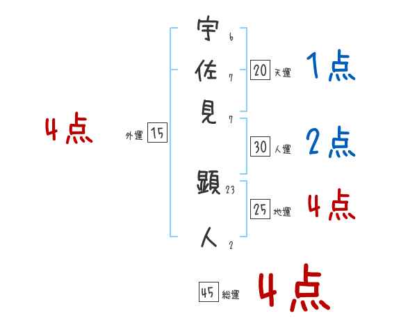 総運![]() | 宇佐見顕人さんの総運は45画の4つ星!もくもくと物事を進め達成する。地味な努力家。 あなたの人生を表す1番重要な運勢です。生涯を通じて影響する総合運となり、主に50歳以降の晩年期に影響を及ぼします。 |