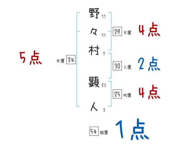 天運![]() | 野々村顕人さんの天運は29画の4つ星!完全主義で才能がある。厳格な心の持ち主。 家系が持つ宿命的な運勢を表します。祖先から受け継いだ苗字ですので自分の力が及びません。家柄を象徴します。 |