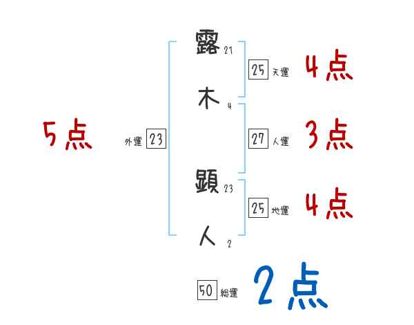 天運![]() | 露木顕人さんの天運は25画の4つ星!個性があり才能があふれる。強運の持ち主で発展する。 家系が持つ宿命的な運勢を表します。祖先から受け継いだ苗字ですので自分の力が及びません。家柄を象徴します。 |