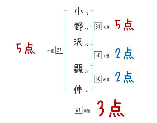 外運![]() | 小野沢顕伸さんの外運は21画の5つ星!統率力がある。独立し成功する。名誉を手に入れる。 生活面を象徴する運勢です。外部から受ける影響力を表し、結婚運、家庭運や職場、環境への順応性を表します。 |