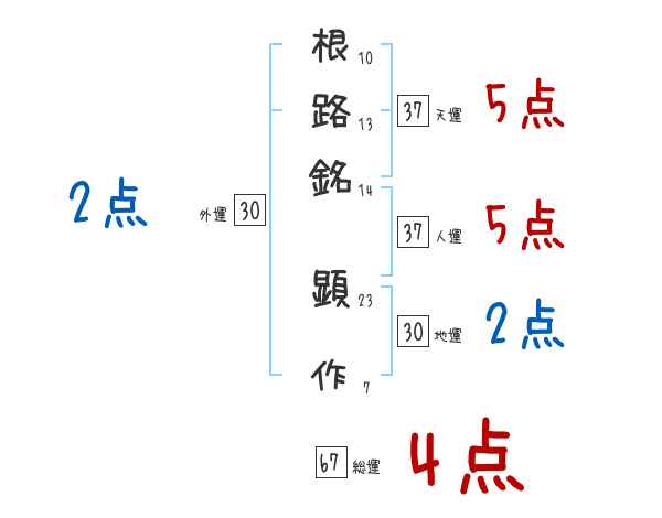 外運![]() | 根路銘顕作さんの外運は30画の2つ星!浮き沈みの激しさに注意しましょう。 生活面を象徴する運勢です。外部から受ける影響力を表し、結婚運、家庭運や職場、環境への順応性を表します。 |