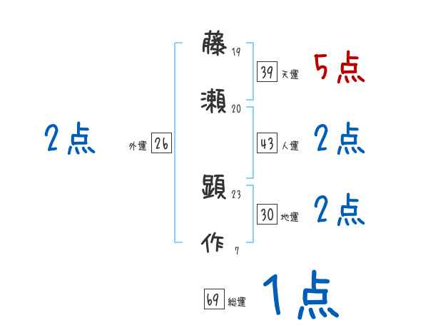 総運![]() | 藤瀬顕作さんの総運は69画の1つ星!不満を感じやすい傾向が。ストレスを貯めないように注意しましょう。 あなたの人生を表す1番重要な運勢です。生涯を通じて影響する総合運となり、主に50歳以降の晩年期に影響を及ぼします。 |