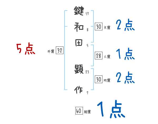 外運![]() | 鍵和田顕作さんの外運は32画の5つ星!柔軟性があり成功する。チャンスが多く金運が良い。 生活面を象徴する運勢です。外部から受ける影響力を表し、結婚運、家庭運や職場、環境への順応性を表します。 |