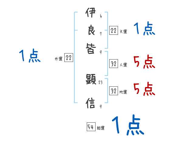 人運![]() | 伊良皆顕信さんの人運は32画の5つ星!柔軟性があり成功する。チャンスが多く金運が良い。 性格や才能などを表す2番目に重要な運勢です。人間関係や協調性、社会的な成功に影響します。主に20歳から50歳ぐらいまでの中年期の運勢を表します。 |